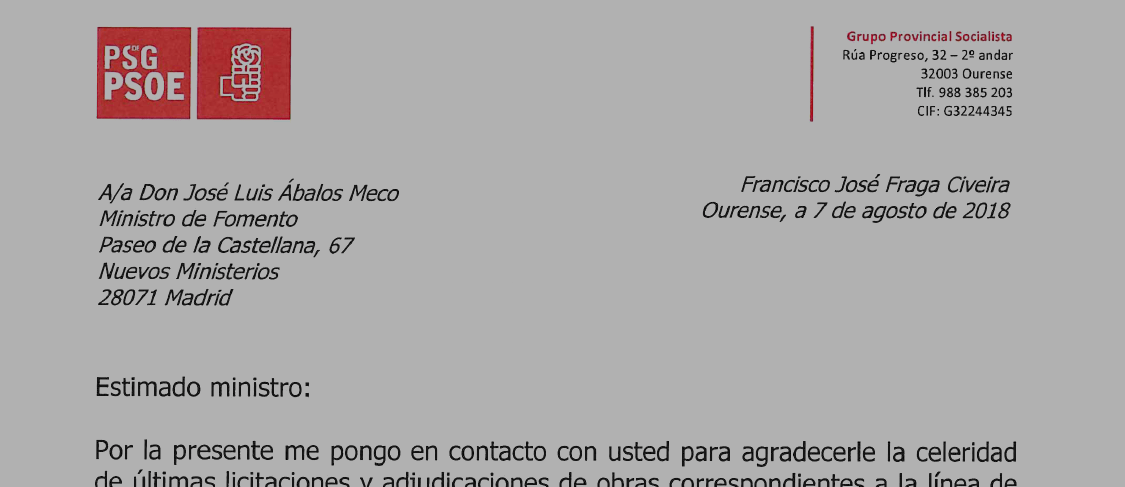 O PSDEG-PSOE PÍDELLE Ó MINISTRO DE FOMENTO POR CARTA QUE LICITE A NOVA LIÑA DO AVE ENTRE TABOADELA E OURENSE LOGO DA PARÁLISE QUE LLE APLICOU O PP DURANTE SETE ANOS