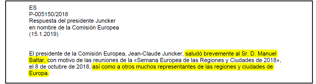 Ourense, 15 de xaneiro de 2019. No máis absoluto dos ridículos. Así quedou Manuel Baltar, o presidente do PP da Deputación de Ourense, logo de ser desmentida a reunión que afirmou ter mantido en outubro de 2018 co presidente da Comisión Europea, Jean-Claude Juncker, que non figuraba en ningunha axenda oficial e que, sen embargo, foi publicitada propagandísticamente polo goberno provincial con fotografías, comunicados e declaracións nos medios. Nunha resposta –achégase copia– ó deputado socialista no Europarlamento, José Blanco, o presidente europeo afirma que só “saludou brevemente ó Sr. D. Manuel Baltar, con motivo das reunións da «Semana Europea das Rexións e Cidades de 2018», o 8 de outubro de 2018, así como a outros moitos representantes das rexións e cidades de Europa”.