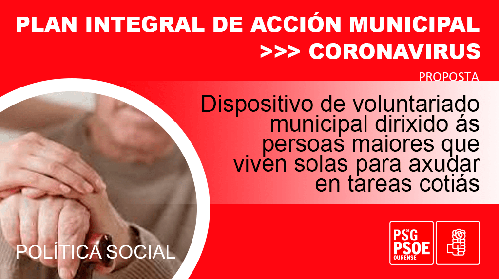 2. Política social: Activar un dispositivo de voluntariado municipal dirixido as persoas maiores que viven solas, co obxecto de axudalas a realizar tarefas cotiáns como a compra de medicamentos e produtos nos supermercados. Dotar ao persoal de axuda no fogar de material preventivo (máscara, luvas e xel), priorizando o servizo aos maiores que carezan de apoio familiar. Crear un programa conxunto con Cruz Vermella, Cáritas e outras ONGs, para habilitar medidas excepcionais de atención e información as persoas sen fogar que viven na cidade.