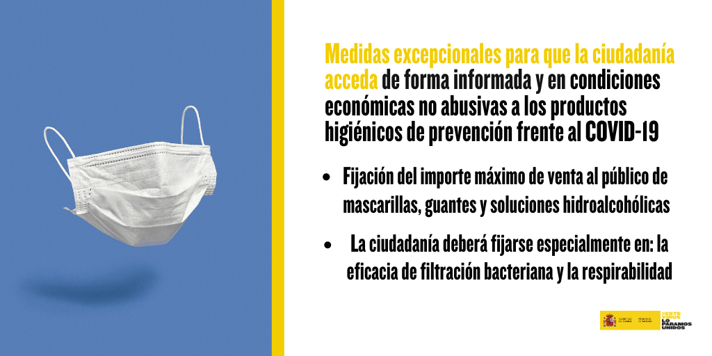 20 de abril de 2020. Con el fin de evitar precios abusivos en mascarillas, geles y otros productos similares para proteger del COVID-19, el Gobierno central ha aprobado la fijación de precios máximos. Con esta medida, el Gobierno pretende establecer las garantías suficientes para que la ciudadanía pueda acceder, en condiciones económicas no abusivas, a productos de protección frente al contagio del SARS-CoV-2.