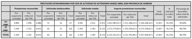 Ourense, 15 de maio de 2020. O Goberno central xa destinou 9.437.606 euros en axudas ós autónomas e autónomas de Ourense durante os meses de marzo e abril de 2020, afectados pola paralización económica derivada da emerxencia sanitaria causada polo virus SARS-CoV-2. Durante ese período foron recoñecidas e abonadas 8.031 prestacións extraordinarias, o que representa o 98,74 % das solicitadas, cun importe medio de 750 euros. Unha cifra similar será pagada novamente a miles de ourensáns polo mes de maio.