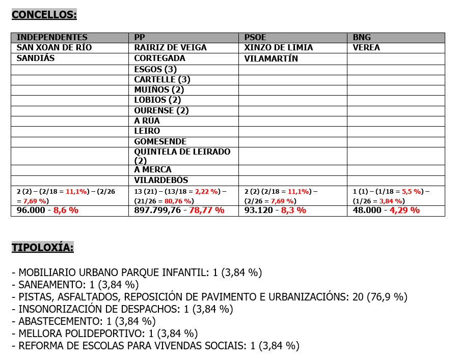 O voceiro dos socialistas, Rafa Villarino, compareceu acompañado do senador e secretario de organización do PSdeG-PSOE, Juan Carlos Francisco; do deputado provincial, Nacho Gómez; e da candidata ao Parlamento de Galicia, Marina Ortega. Villarino destacou “o cinismo do presidente que dixo que era tempo de persoas e non de obras mentres practicaba o clientelismo e adxudicaba 1 millón de euros en obras innecesarias”. “Estamos ante o sistema caciquil, o dedo de sempre, mentres había unha traxedia aí fóra”, denunciou o voceiro logo de destacar que a meirande parte destas adxudicacións están vinculadas “a empresas de sempre ou persoas próximas ao PP”.