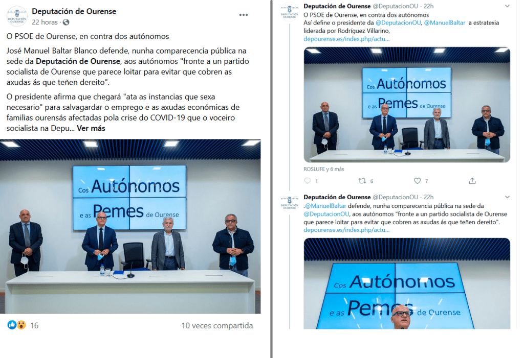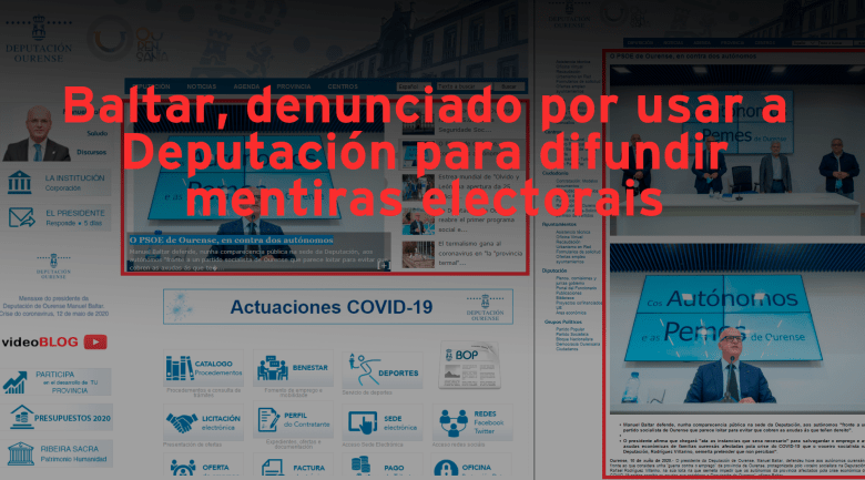 Ourense, 11 de xuño de 2020. O PSdeG-PSOE vén de denunciar a Manuel Baltar ante a xunta electoral polo “uso partidista e propagandístico” da páxina web e das redes sociais oficiais da Deputación de Ourense, logo de que o goberno bipartito de PP e DO estea a empregar estes espazos institucionais para facer campaña electoral e difundir falsedades. Concretamente, o goberno provincial publicou o día 10 de xuño na web http://www.depourense.es, unha extensa nota titulada “O PSOE de Ourense, en contra dos autónomos”, tanto na portada principal como nunha entrada propia, que “pouco ten que ver co carácter institucional que deben ter estes espazos informativos”. Así mesmo, as contas oficiais en redes sociais difundiron publicacións coa mesma mensaxe.