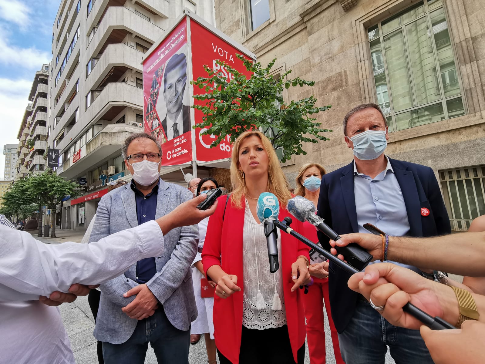 Ourense, 29 de xuño de 2020. Os socialistas de Ourense celebran o compromiso do candidato do PSdeG-PSOE á presidencia da Xunta, Gonzalo Caballero, para darlle a cidade a estación intermodal que merece, logo do “pendello” que o goberno de Feijóo pretende levantar no barrio da Ponte, tras tombar o proxecto do ano 2011 e recortar o investimento. Ante o stand electoral ─un container vertical─ na rúa do Paseo, o secretario provincial, Rafa Villarino, resaltou o compromiso socialista para reformular o proxecto: “ou pendello de Feijóo con 300 autobuses ao día xunto ao centro de saúde ou intermodal de Caballero, moderna, integrada e respectuosa con Ourense”.