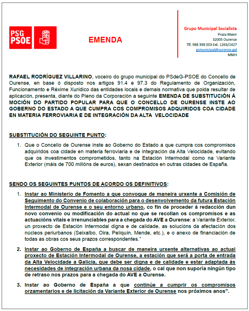 Esta emenda a unha moción do PP igualmente demanda a “convocatoria urxente” da comisión de seguimento do convenio de colaboración para o desenvolvemento da futura estación intermodal e o seu entorno urbano, co fin de “proceder á redacción dun novo convenio ou modificación do actual”, para que “se recollan os compromisos e as actuacións vitais e irrenunciables para a chegada do AVE”.