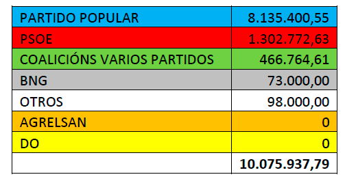 Deses 20 millóns, 10 son directamente para os concellos mediante subvencións a dedo. Esta é a distribución dos fondos públicos provinciais mobilizados entre os concellos, nesta modificación de crédito, segundo o partido de goberno: