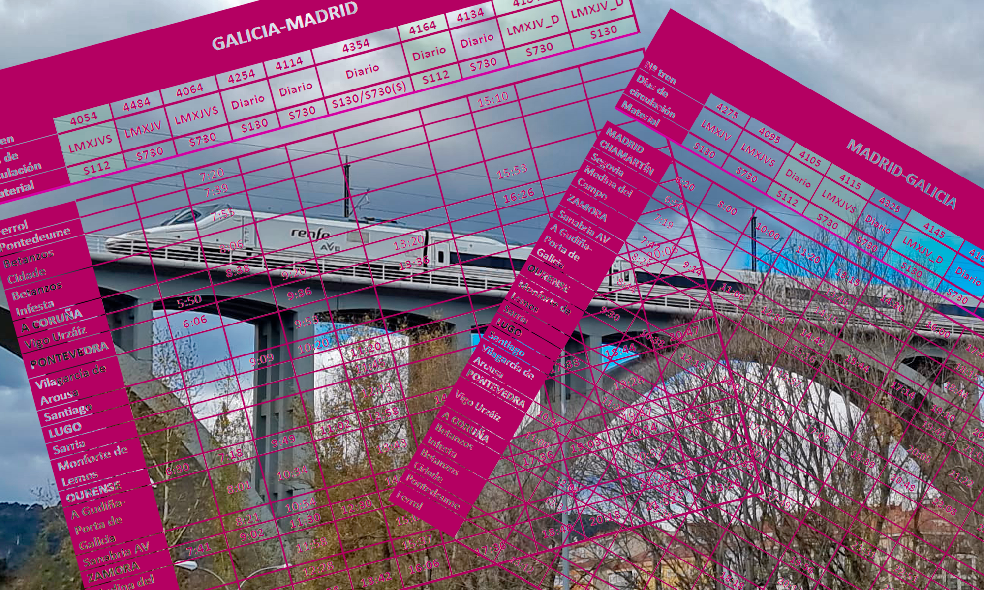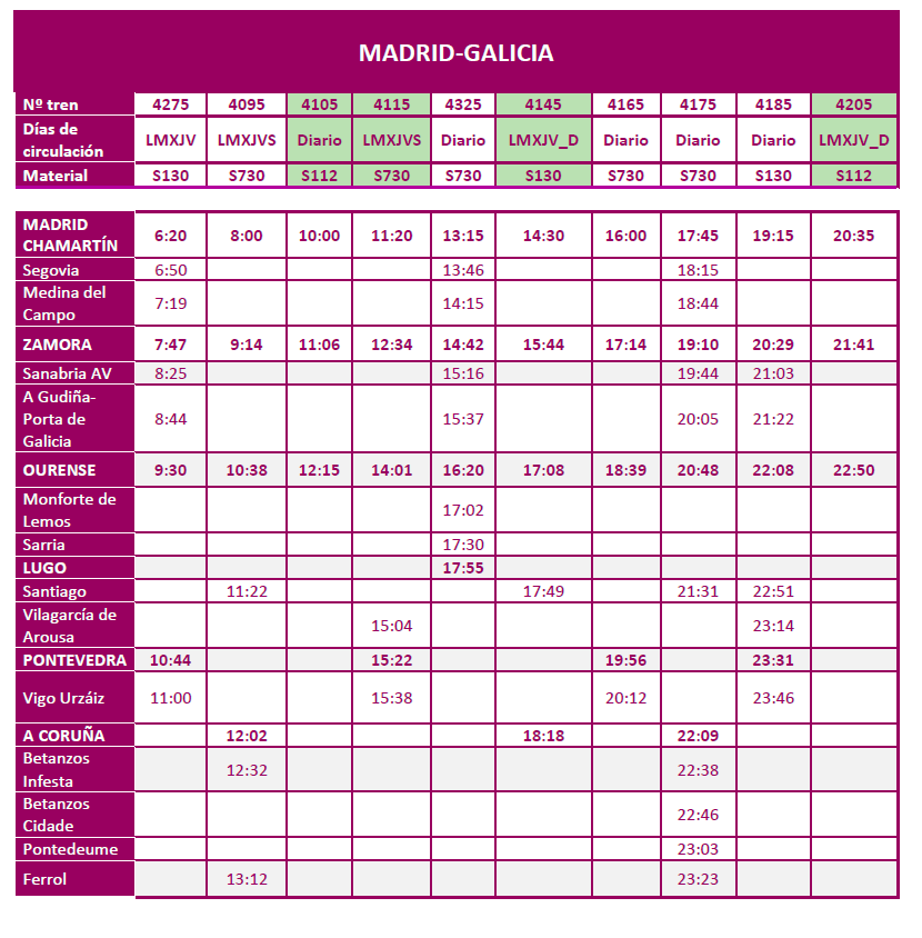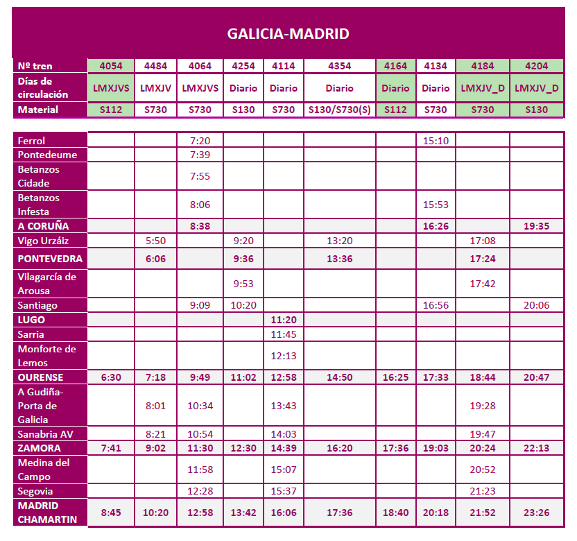 Estes son os horarios dos servizos que operarán ata o segundo semestre de 2022, cando chegarán a Galicia os novos trens Avril, actualmente en fabricación, o que permitirán reducir máis os tempos de viaxe e aumentar as frecuencias.