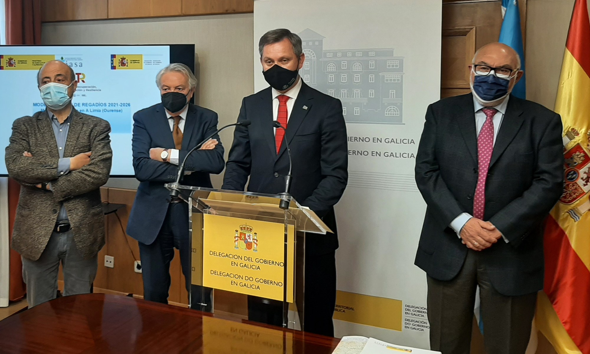A Coruña, 8 de marzo de 2022. O delegado do Goberno en Galicia, José Miñones, e o presidente da Sociedade Mercantil Estatal de Infraestruturas Agrarias (SEIASA), Francisco Rodríguez Mulero, anunciaron este martes o “investimento histórico para Galicia” de máis de 19 millóns de euros para modernizar os regadíos da comarca da Limia con cargo á Fase II do Plan de Recuperación, Transformación e Resiliencia. Nun encontro coas comunidades de regantes da Limia celebrado la Delegación do Goberno, José Miñones cualificou esta mellora como un proxecto “de vital importancia para o sector primario” de Galicia e, en especial, da provincia de Ourense. O delegado avanzou ademais que a este investimento sumaranse 12 millóns de euros mais que o Ministerio de Agricultura achegará para a limpeza das canles da Limia e dos camiños, co obxectivo de mellorar a xestión e reducir a afección medioambiental.