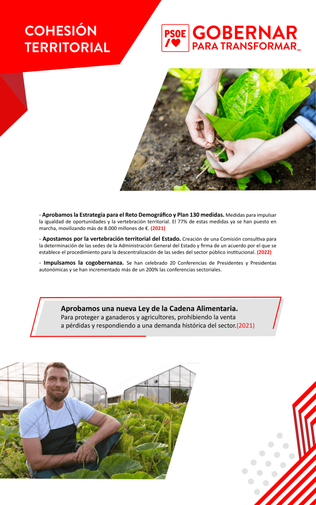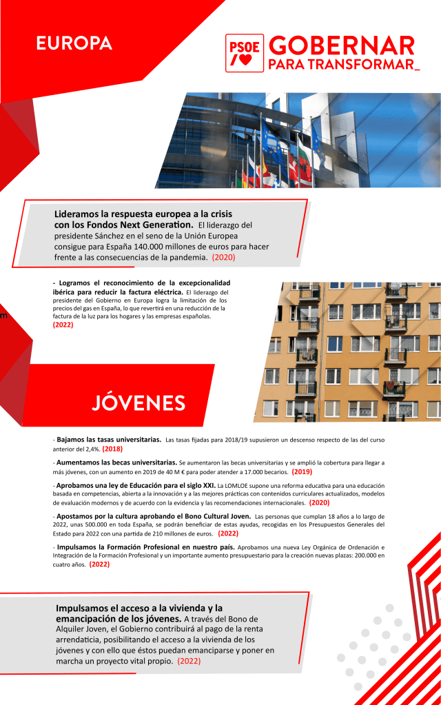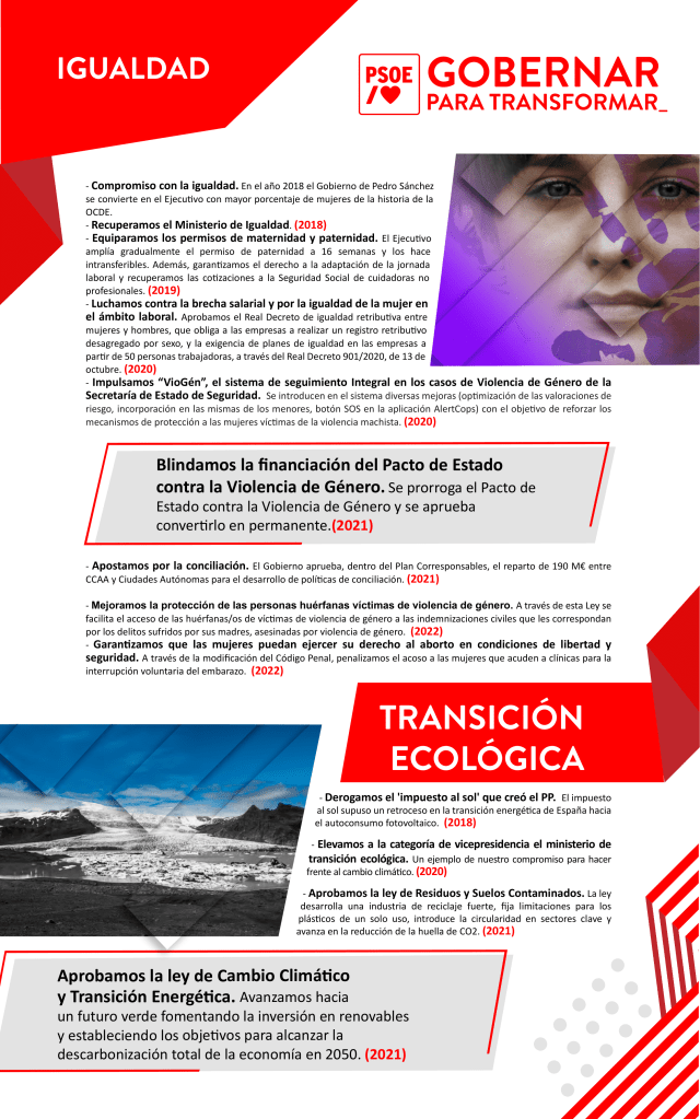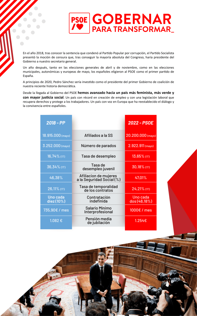 Os e as socialistas explican que “nós gobernamos para mellorar o presente e o futuro, mentres o PP segue ancorado no seu pasado», algo que se evidencia “facendo balance dos catro anos transcorridos desde que o PSOE chegou ao Goberno” e que se recolle no plan ‘Gobernar para transformar’ onde “queda evidenciado todo o que España avanzou neste tempo”.