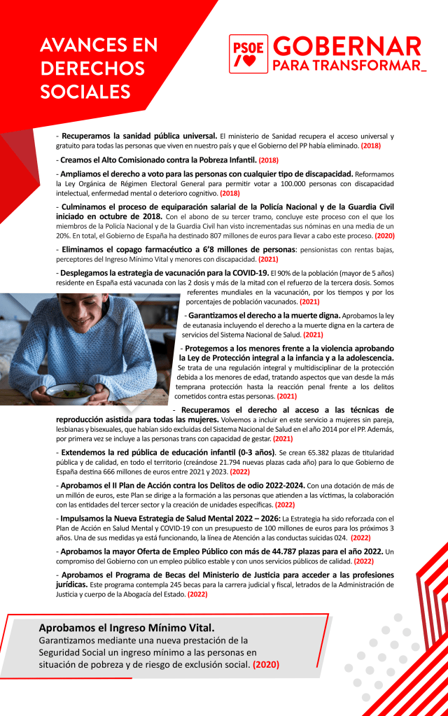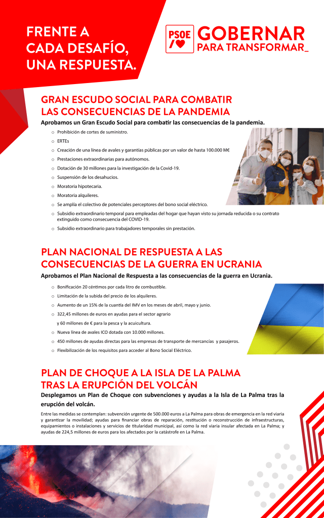 Por iso recordan que, a pesar dos imprevistos históricos destes anos como a pandemia mundial da Covid-19 ou a erupción do volcán de La Palma, desde o PSOE “sempre respondemos do mesmo xeito: protexendo a economía e as familias españolas, empezando polos máis vulnerables”. “Temos un mandato claro: que España teña un goberno social e exemplar”, aseveran. “Coas nosas políticas e a pesar das dificultades que atravesa a nosa sociedade, estamos cambiando a vida das persoas para mellor”, recordan “ante a constante tensión e os insultos da dereita e da extrema dereita”.