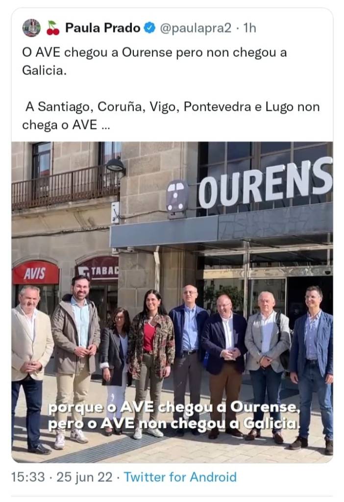 Ourense, 29 de xuño de 2022. A Agrupación Municipal do PSdeG-PSOE de Ourense denuncia un novo desprezo do Partido Popular á cidade das Burgas, tralas declaracións da súa Secretaria Xeral, Paula Prado, sobre a chegada do AVE. Os socialistas considéranas un “insulto e menosprezo” á cidadanía e “unha mostra máis do desleixo da Xunta de Galicia coa nosa cidade”. Tal e como levan amosado dende a paralización na licitación da chegada do AVE a Ourense con Ana Pastor, o cambio no proxecto da estación intermodal con Jesús Vázquez na Alcaldía de Ourense e Rajoy na Moncloa e o “pendello” da estación de autobuses de Ethel Vázquez e Alberto Núñez Feijoo.