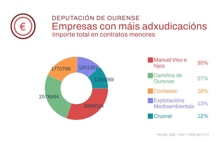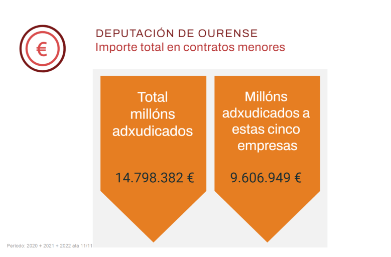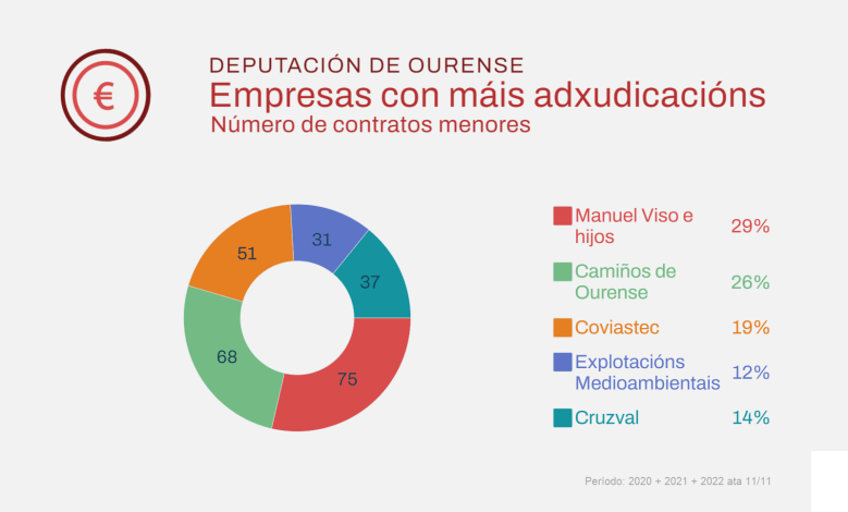 Ourense, 16 de novembro de 2022. O PSdeG-PSOE denunciou hoxe que Manuel Baltar está a ignorar as severas advertencias que o Consello de Contas detallou nun informe, tras agravar, ao longo dos últimos tres anos, a “trama millonaria” de “contratos a dedo” que mantén na Deputación de Ourense. Só cinco empresas (Manuel Viso e hijos; Camiños de Ourense; Coviastec; Explotacións Medioambientais e Cruzval) acumularon o 65 % dos contratos menores adxudicados pola institución provincial. É dicir: estas empresas recibiron a dedo e sen concurso público do goberno de Baltar, máis de 9,6 dos 14,8 millóns adxudicados nos anos 2020, 2021 e no que vai de 2022. Estas cifras tamén destapan que, dos 425 contratos menores tramitados, 262 foron parar sen concurso algún a estas cinco empresas.