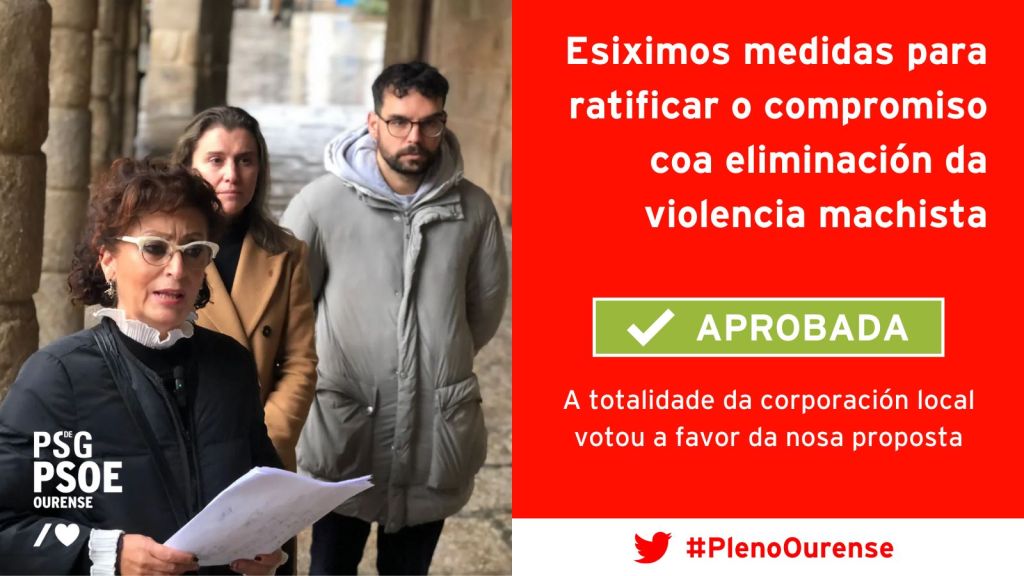 O PSDEG-PSOE DE OURENSE LOGRA O APOIO UNÁNIME DO PLENO A PROL DE IMPULSAR MEDIDAS PARA RATIFICAR O COMPROMISO DO CONCELLO E DA XUNTA COA ELIMINACIÓN DA VIOLENCIA MACHISTA