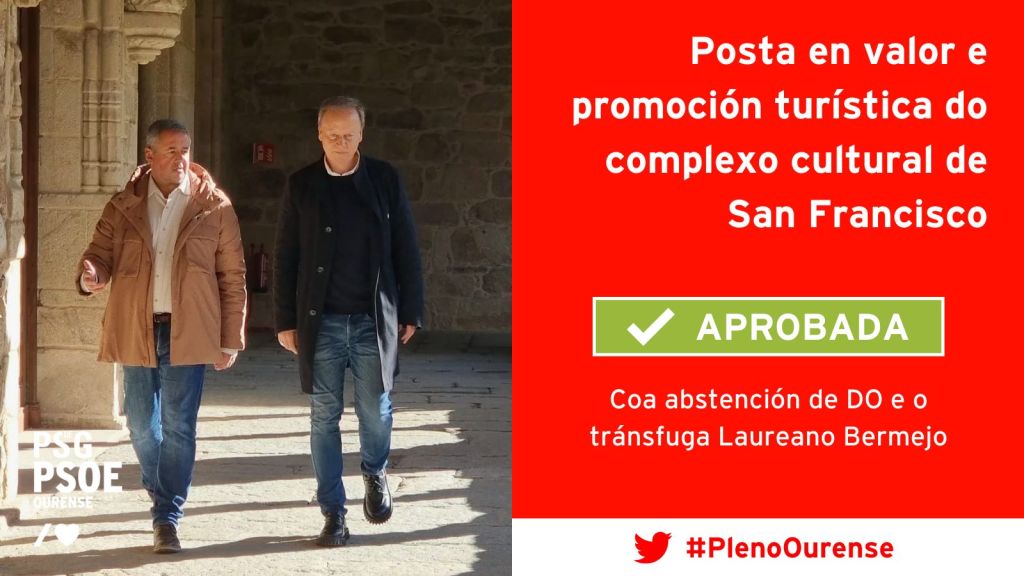 Tamén foi aprobada, coa abstención do grupo de goberno e do tránsfuga Laureano Bermejo, a iniciativa socialista a prol da promoción conxunta, coordinada e integral do complexo cultural de San Francisco por parte do Concello e da Xunta de Galicia.