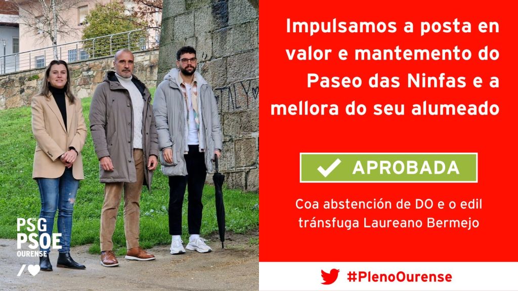 No tocante á moción para reclamar melloras na iluminación e no pavimento do Paseo do Miño, a iniciativa foi aprobada coa abstención do grupo de goberno de Democracia Ourensana, malia constar un decreto asinado o pasado día 30 de decembro no que xa se contempla a renovación da luminaria deste “privilexiado espazo de esparexemento”, actualmente en estado de lamentable abandono por parte do goberno de Jácome.