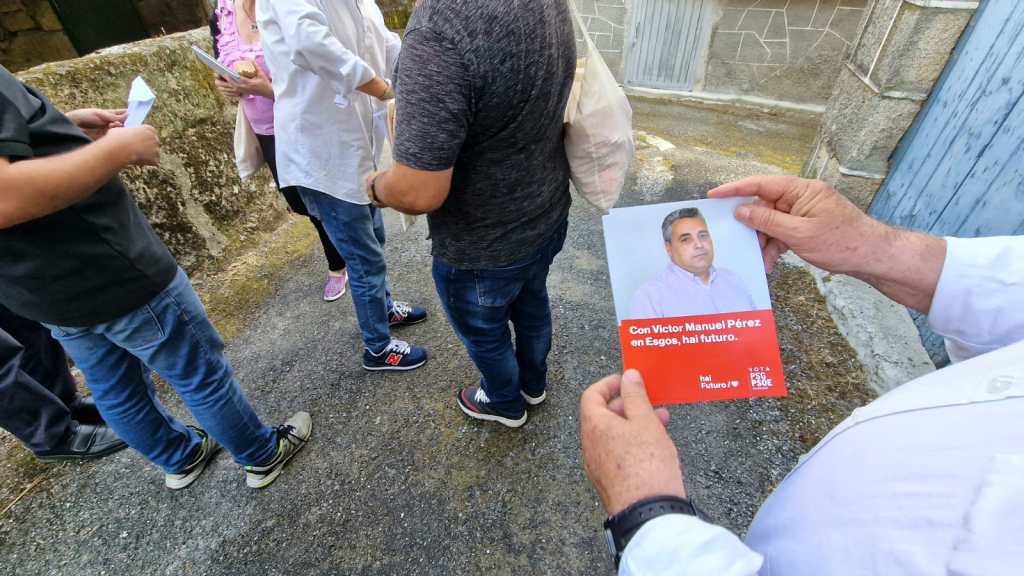 Esgos, 24 de maio de 2023. O PSdeG-PSOE participou esta tarde nun reparto informativo no concello de Esgos, no que aproveitaron para seguir presentándolle á veciñanza o proxecto que queren levar a cabo no municipio os próximos 4 anos se lles outorgan a súa confianza. Foron moitos os veciños e as veciñas que escoitaron atentamente as explicacións e as aclaracións sobre o programa que presentan os e as socialistas.