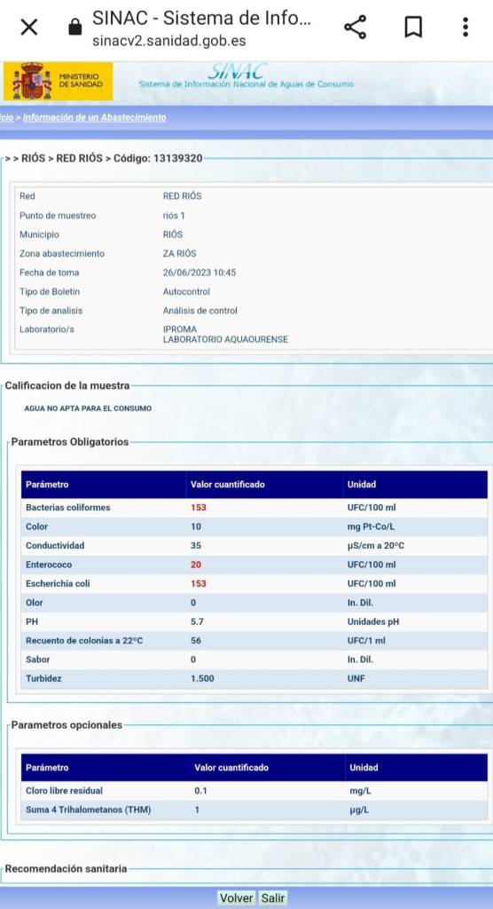 Dende o grupo municipal socialista explican que tiveron constancia da situación a través do sistema de información nacional de augas de consumo (SINAC), dependente do Ministerio de Sanidade e apuntan que “na análise hai tres parámetros que no real decreto 3/2023 do 10 de xaneiro se definen como obrigatorios e cuxos valores están fora de rango”. Neste caso e tal e como apuntan os e as socialistas “os parámetros anómalos fan referencia as bacterias coliformes, cun valor de 153, ao enterococo, cun valor de 20 e a escherichia coli, cun valor de 153, cando en todos os casos debería ser 0, como o foron en anteriores analíticas”.