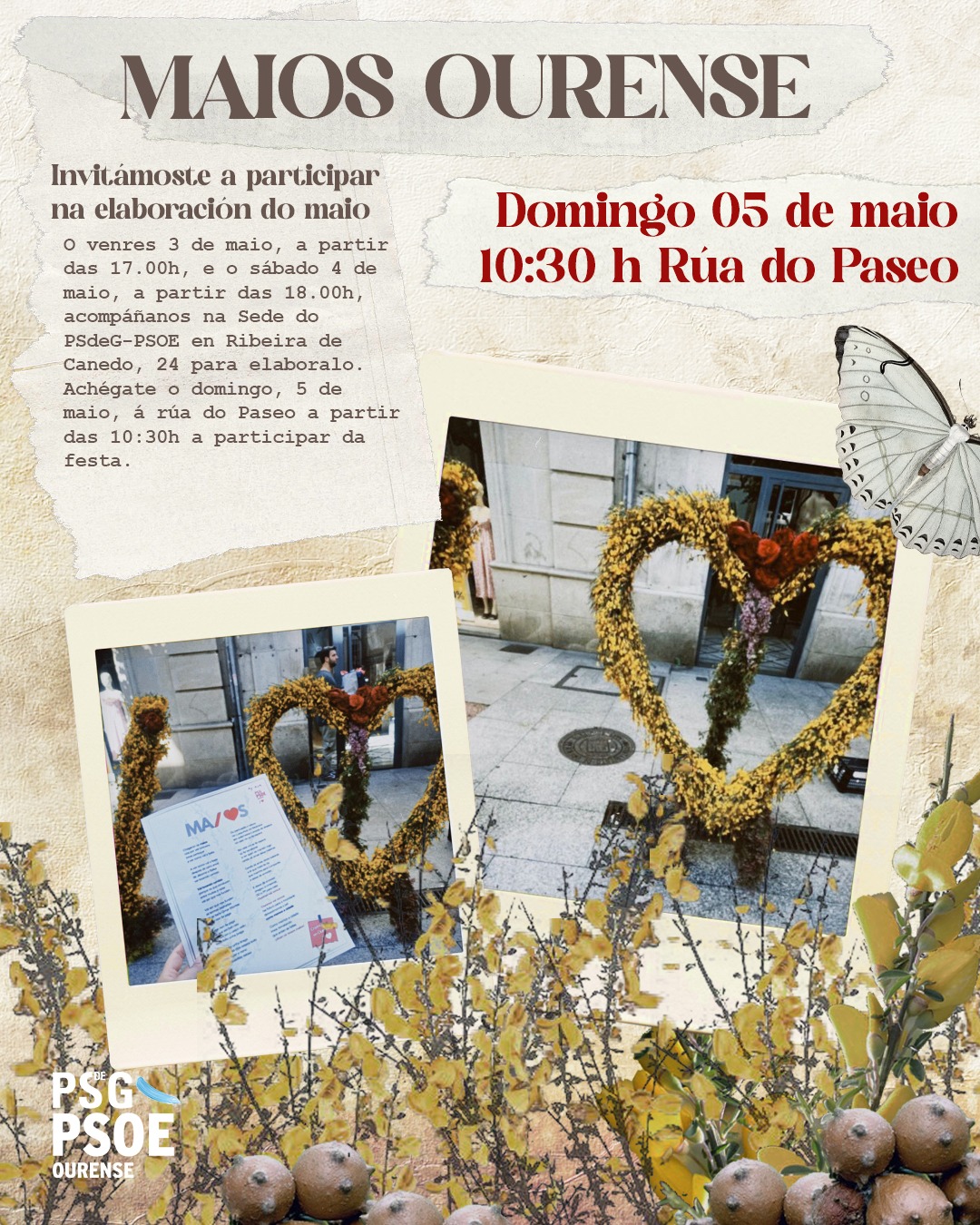 Ourense, 2 de maio de 2024. Dende a Agrupación Municipal do PSdeG-PSOE de Ourense queren convidar á cidadanía a participar nunha das festas tradicionais máis importantes para a cidade: os maios. Por este motivo, a secretaria xeral, Natalia González Benéitez, explica que este ano abrirán as portas de sede do partido (na rúa Ribeira de Canedo, nº 24-26) para todas aquelas persoas que se animen á elaborar ou queiran aprender como é o proceso.