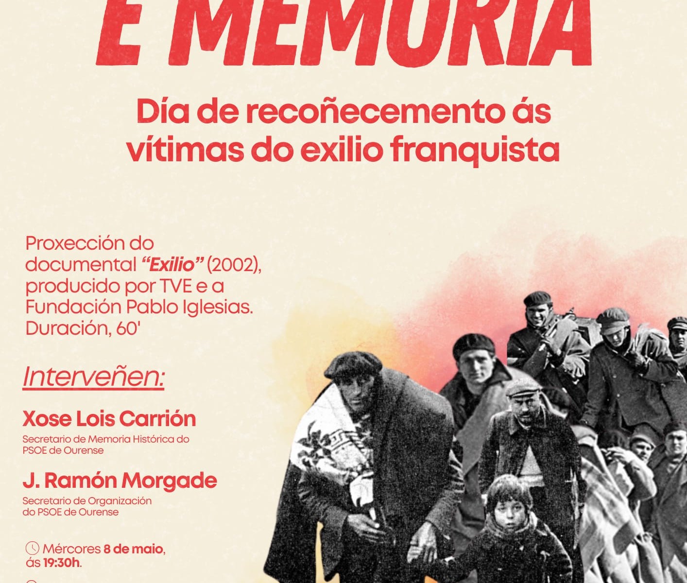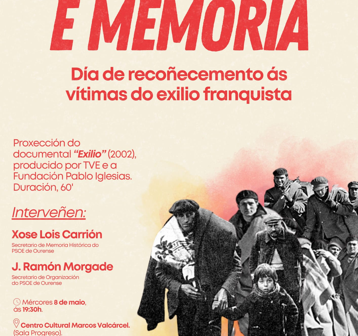 É por elo que dende a propia CEM e as Xuventudes Socialistas de Ourense, xunto coa colaboración da Fundación Pablo Iglesias, organizan un acto para render homenaxe a aquelas e aqueles que tiveron que exiliarse, como consecuencia da guerra e a ditadura franquista, nun acto que terá lugar no Centro Cultural Marcos Valcárcel ás 19.30 horas e cuxo eixo central será a proxeción do documental Exilio (producido por TVE e dita fundación, no 2002).