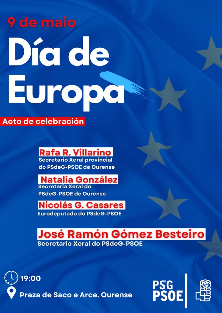 Por todo elo, mañá terá lugar un acto, ás 19.00 horas na praza Saco e Arce, no que intervirán o secretario provincial do partido, Rafael Rodríguez Villarino; a secretaria xeral en Ourense, Natalia González Benéitez; o eurodeputado na pasada lexislatura e candidato para o próximo proceso electoral, Nicolás González Casares; e o secretario xeral do PSdeG, José Ramón Gómez Besteiro. Ademais, haberá unha actuación musical ao remate das intervencións.