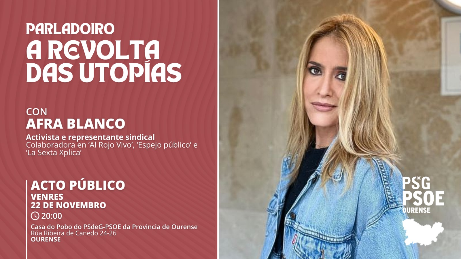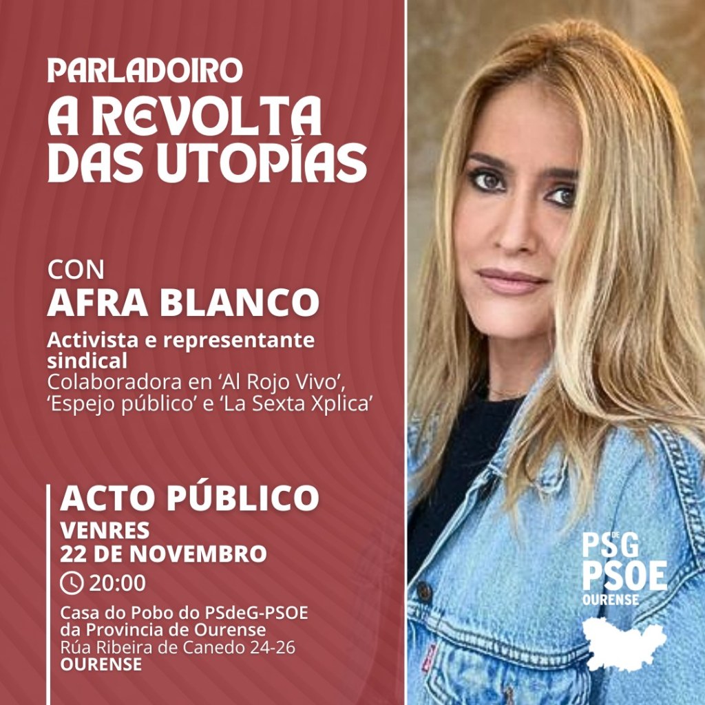 O PSDEG-PSOE DE OURENSE ORGANIZA ESTE VENRES UN ACTO NA CASA DO POBO QUE CONTARÁ COA PRESENZA DA SINDICALISTA, AFRA BLANCO, E BAIXO O TÍTULO “A REVOLTA DAS UTOPÍAS”