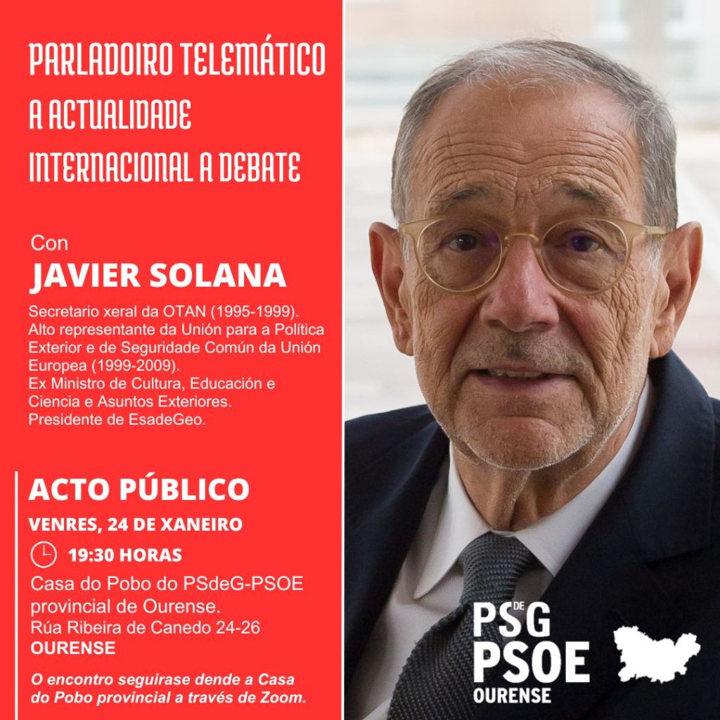 Ourense, 22 de xaneiro de 2025. O PSdeG-PSOE de Ourense organiza este venres, día 24, ás 19:30 horas, na Casa do Pobo provincial, un novo parladoiro aberto á cidadanía, no que se analizará a actualidade internacional da man de Francisco Javier Solana y de Madariaga. Un novo acto, que nesta ocasión realizarase de xeito telemático e no que todas aquelas persoas que o desexen poderán participar dende a sede provincial socialista, interactuando en directo co protagonista deste parladoiro.
