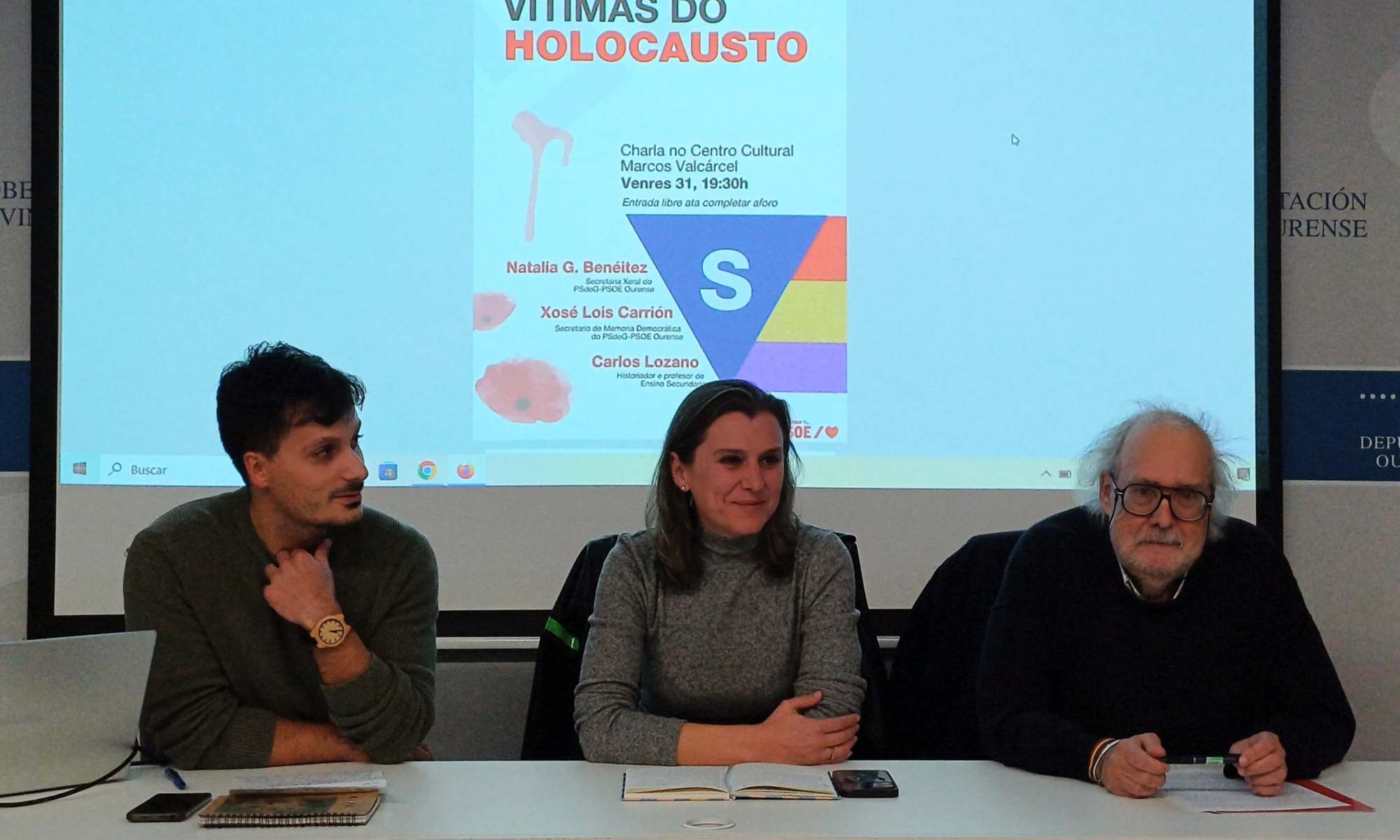 Ourense, 31 de xaneiro de 2025. En 2005, a asemblea xeral de Nacións Unidas aprobou unha resolución pola que se elixía o 27 de xaneiro como o Día Internacional en Memoria das Vítimas do Holocausto e co gallo desta data a Comisión Executiva Municipal do PSdeG de Ourense organizou un acto aberto á cidadanía. “Calcúlase que naquela gran matanza de homes e mulleres, nun intento de exterminio sistemático de xudeus e doutros grupos humanos como xitanos, minorías relixiosas, persoas con discapacidade, homosexuais e transexuais, que por medio de execucións, cámaras de gas, traballos forzados, torturas, fame, experimentos médicos ou malleiras foron asasinadas máis de 11 millóns de persoas”, puntualizou o secretario de Memoria Democrática do partido, Xosé Lois Carrión, ao comezo da charla.