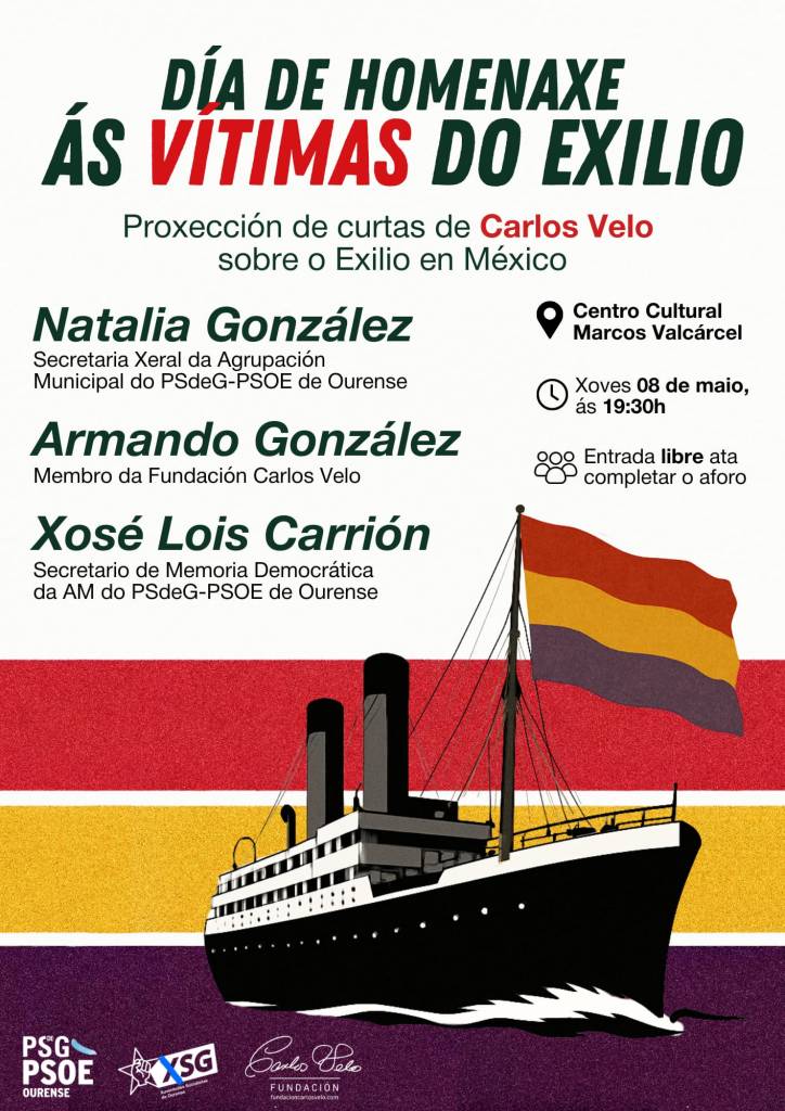 “Outro protagonista do acto organizado polo PSdeG de Ourense, é o nado en Cartelle Carlos Velo Cobelas, quen marchou ao exilio mexicano desde Saint Nazaire o 21 de abril de 1939, chegando 2 semanas despois a Veracruz. Viaxou a bordo do buque Flandre”, remata.