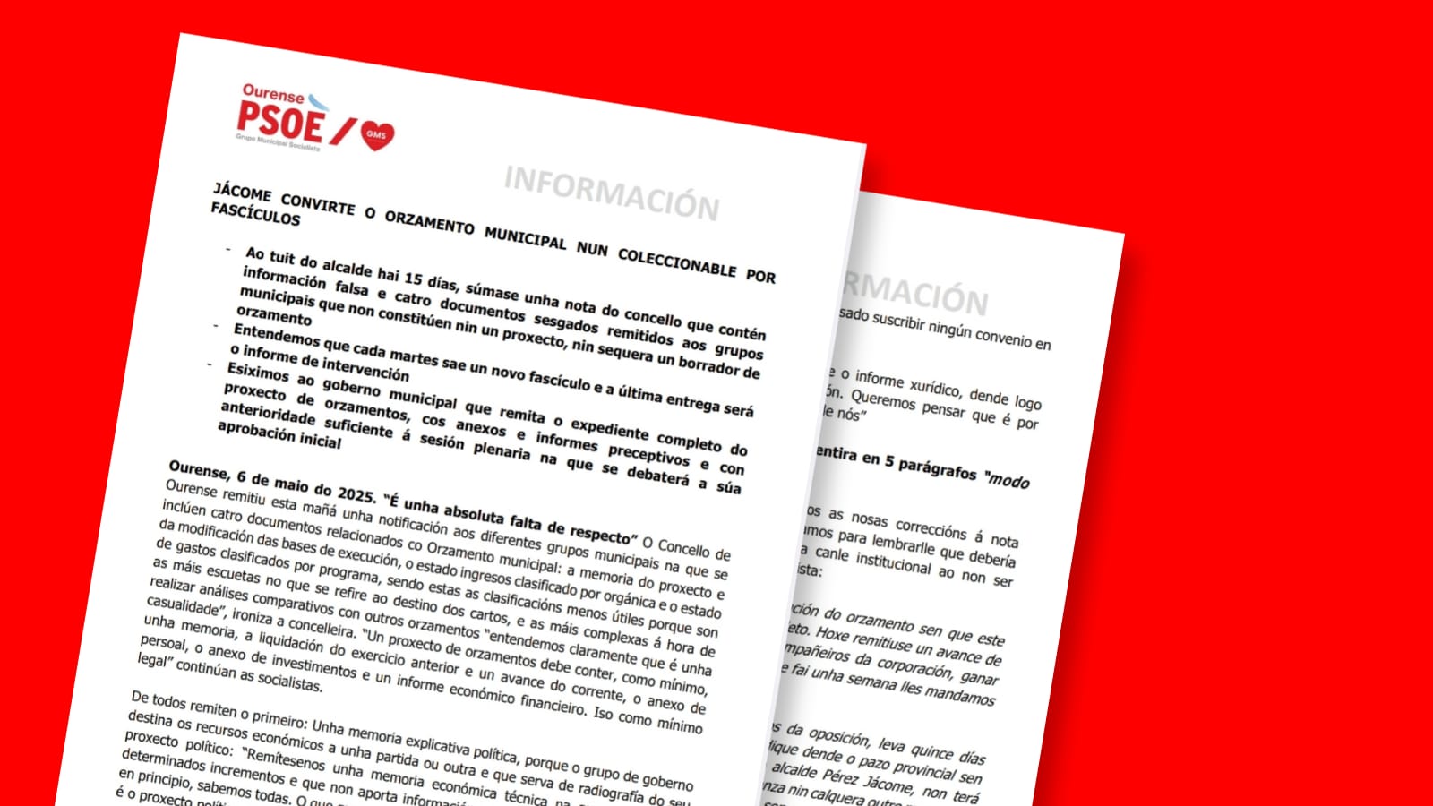 Ourense, 6 de maio do 2025. “É unha absoluta falta de respecto” O Concello de Ourense remitiu esta mañá unha notificación aos diferentes grupos municipais na que se inclúen catro documentos relacionados co Orzamento municipal: a memoria do proxecto e da modificación das bases de execución, o estado ingresos clasificado por orgánica e o estado de gastos clasificados por programa, sendo estas as clasificacións menos útiles porque son as máis escuetas no que se refire ao destino dos cartos, e as máis complexas á hora de realizar análises comparativos con outros orzamentos “entendemos claramente que é unha casualidade”, ironiza a concelleira. “Un proxecto de orzamentos debe conter, como mínimo, unha memoria, a liquidación do exercicio anterior e un avance do corrente, o anexo de persoal, o anexo de investimentos e un informe económico financieiro. Iso como mínimo legal” continúan as socialistas.