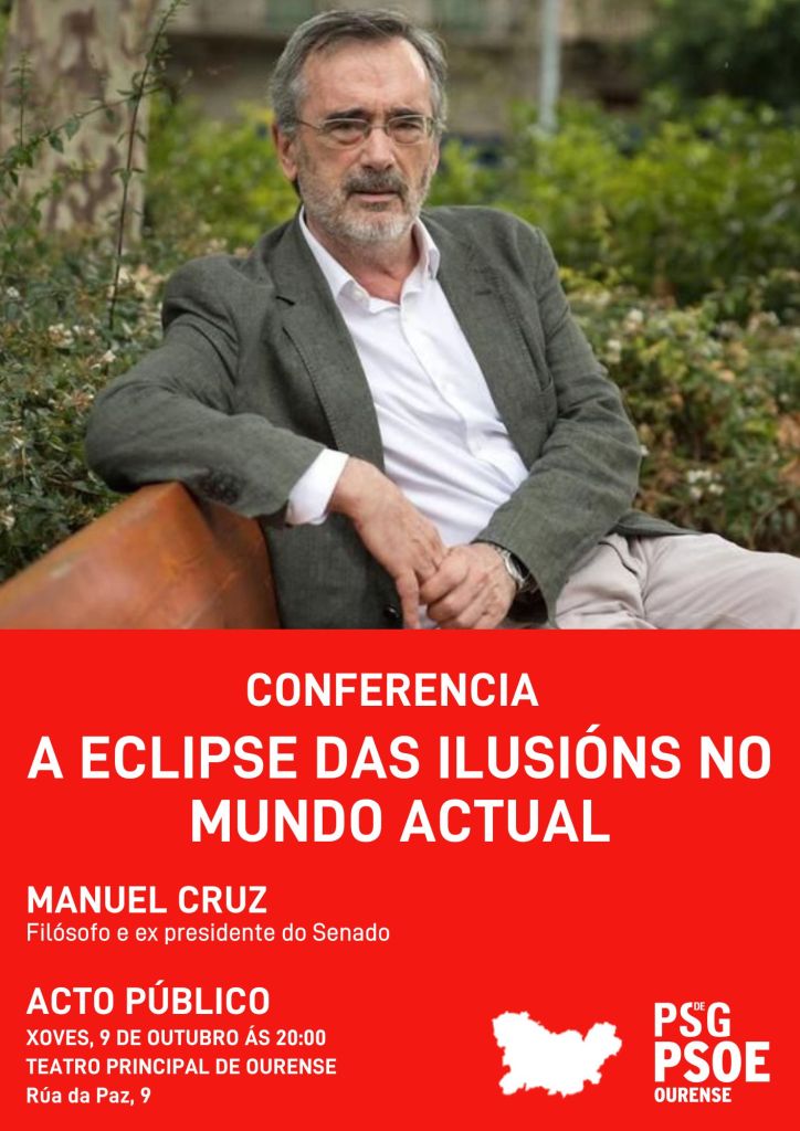 A conferencia, que terá como título “A eclipse das ilusións no mundo actual” terá como finalidade compartir reflexións e sensacións cunha persoa que conta cunha gran e excepcional bagaxe cultural. Manuel Cruz é catedrático de filosofía contemporánea da Universidade de Barcelona, autor de máis de 40 libros, directos de varias coleccións e conta con varios premios como o Anagrama 2005. E ademais colaborador habitual en varios medios de comunicación como El País, La Vanguardia, El Confidencial, a Cadena Ser ou Catalunya Radio. O seu compromiso social impulsouno á vida política, integrándose no PSC, onde foi elixido deputado no Congreso e despois senador, presidindo esta cámara na XIII lexislatura e onde segue sendo senador na actualidade.