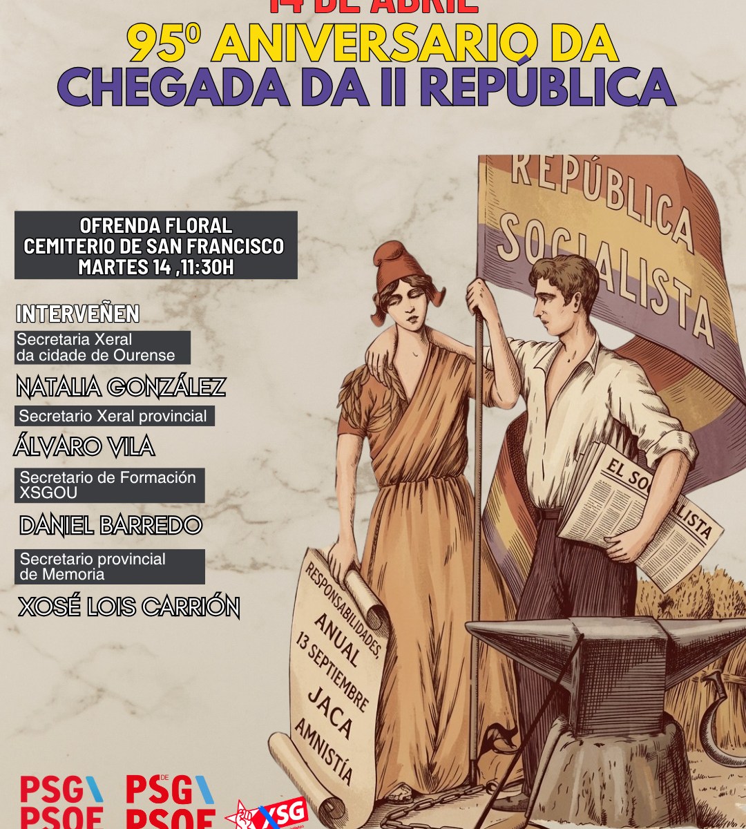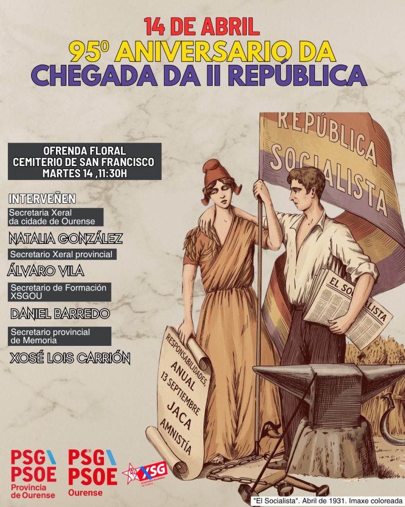 Ourense, 11 de abril de 2026. As Executivas Provincial e Local do PSdeG-PSOE de Ourense e Xuventudes Socialistas de Ourense organizan o martes 14 de abril un acto homenaxe con motivo do 95º aniversario da proclamación da II República española en 1931.