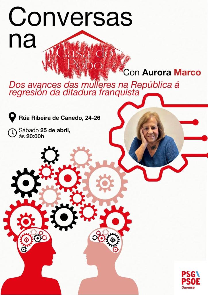 Nesta ocasión, a convidada de honor será Aurora Marco, quen ofrecerá unha charla baixo o título “Dos avances das mulleres na República á regresión da ditadura franquista”, na que abordará a evolución dos dereitos feministas ao longo da historia recente de España, poñendo o foco nos logros acadados durante a Segunda República e o retroceso sufrido durante o franquismo.